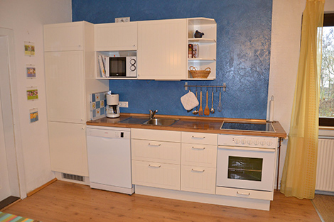 Die große freundliche Wohnküche verfügt über eine moderne Küchenzeile mit Geschirrspüler, Umluft-Herd, Mikrowelle und Kühlschrank mit ***-Gefrierfach. Neben einem Esstisch für 4 Personen befindet sich in diesem Raum eine Schlafcouch und ein Flachbild-Fernseher mit DVD-Player. Bei Bedarf kann ein weiteres Bett beigestellt werden.