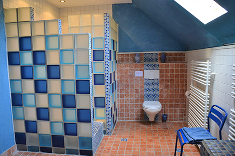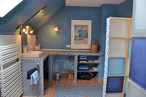 Das Badezimmer mit Dusche ist ebenfalls großzügig geschnitten und stilvoll ausgestattet.